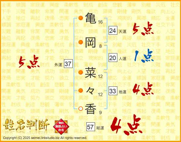 亀(16画)岡(8画) 菜(12画)々(12画)香(9画)