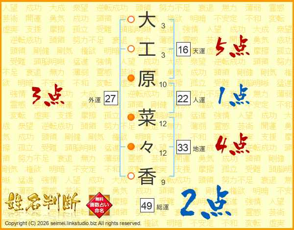 大(3画)工(3画)原(10画) 菜(12画)々(12画)香(9画)