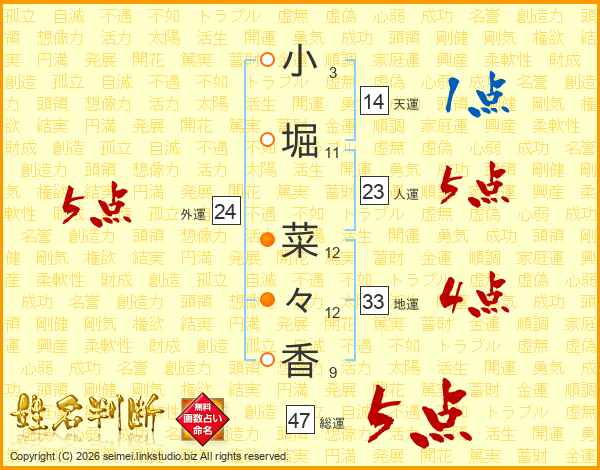 小(3画)堀(11画) 菜(12画)々(12画)香(9画)