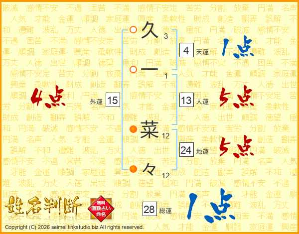生活面を象徴する運勢です。外部から受ける影響力を表し、結婚運、家庭運や職場、環境への順応性を表します。総運から人運を引いた画数。姓や名が1文字の場合を除く。