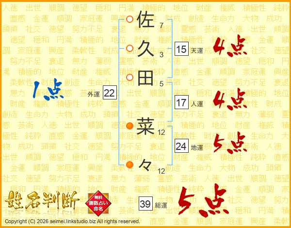 佐久田菜々さんの総運は39画の5点!