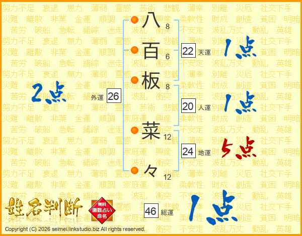 八(8画)百(6画)板(8画) 菜(12画)々(12画)