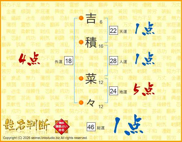 吉(6画)積(16画) 菜(12画)々(12画)