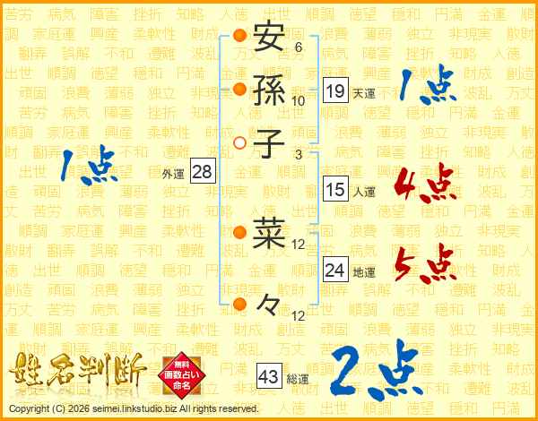 安(6画)孫(10画)子(3画) 菜(12画)々(12画)