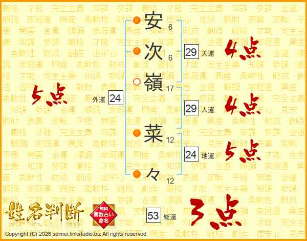 安(6画)次(6画)嶺(17画) 菜(12画)々(12画)