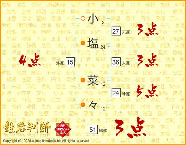 小(3画)塩(24画) 菜(12画)々(12画)