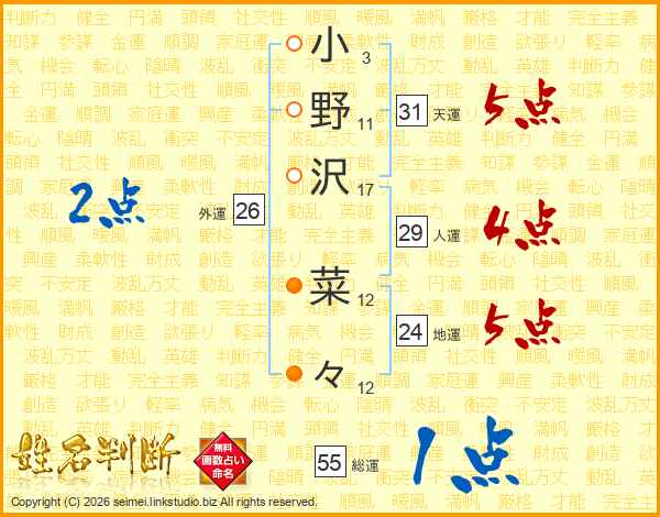 小野沢菜々さんの総運は55画の1点!