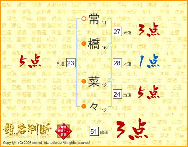 常橋菜々さんの総運は51画の3点!