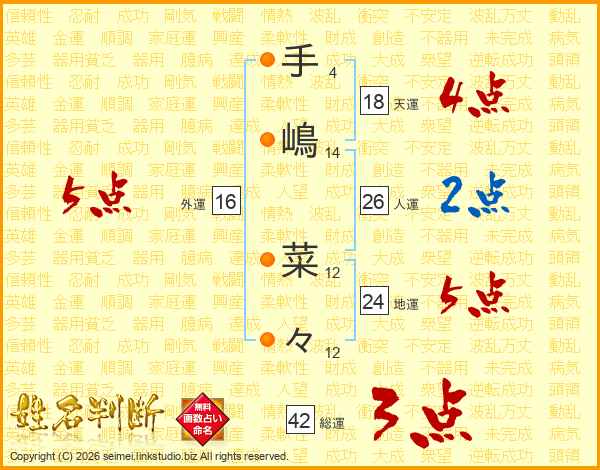 手(4画)嶋(14画) 菜(12画)々(12画)