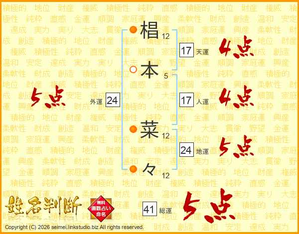 椙(12画)本(5画) 菜(12画)々(12画)