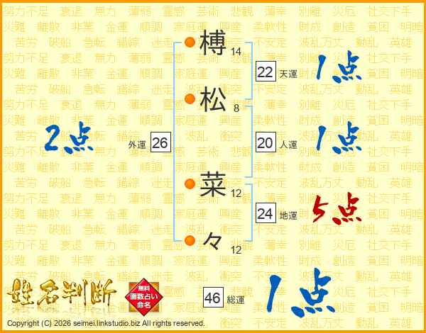 生活面を象徴する運勢です。外部から受ける影響力を表し、結婚運、家庭運や職場、環境への順応性を表します。総運から人運を引いた画数。姓や名が1文字の場合を除く。