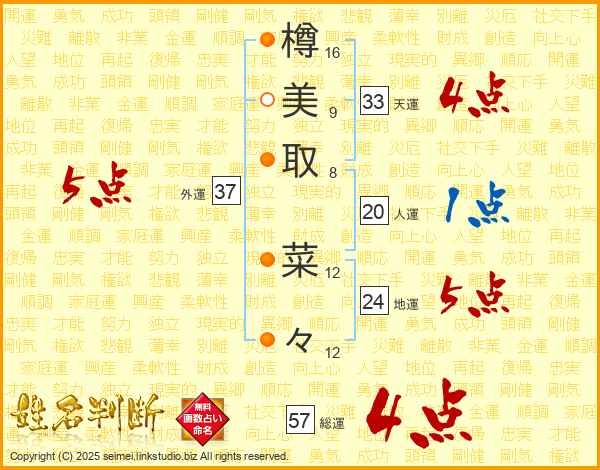 樽(16画)美(9画)取(8画) 菜(12画)々(12画)