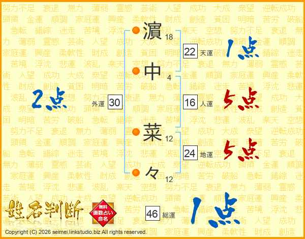 生活面を象徴する運勢です。外部から受ける影響力を表し、結婚運、家庭運や職場、環境への順応性を表します。総運から人運を引いた画数。姓や名が1文字の場合を除く。