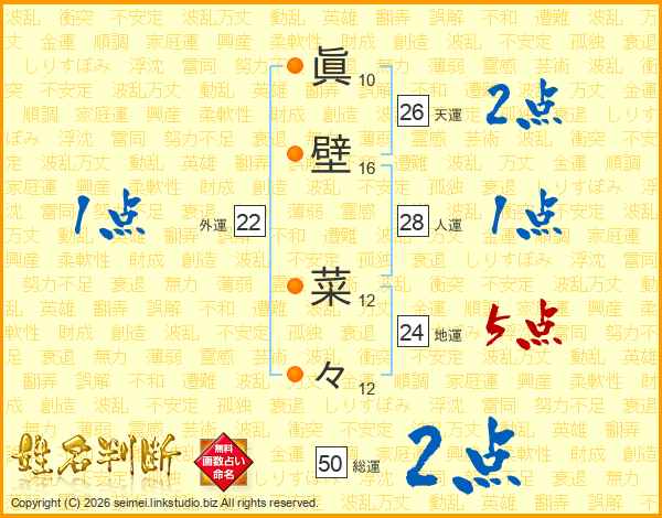 眞(10画)壁(16画) 菜(12画)々(12画)