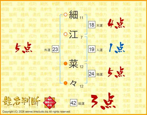 生活面を象徴する運勢です。外部から受ける影響力を表し、結婚運、家庭運や職場、環境への順応性を表します。総運から人運を引いた画数。姓や名が1文字の場合を除く。