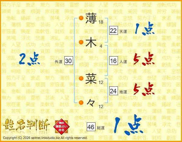薄(18画)木(4画) 菜(12画)々(12画)