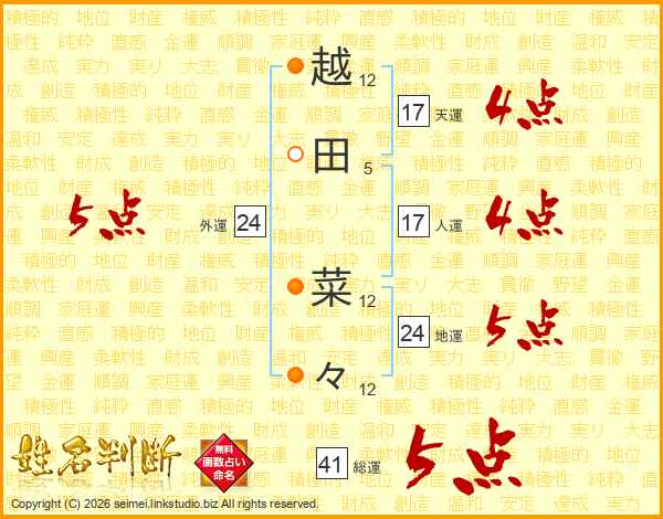 生活面を象徴する運勢です。外部から受ける影響力を表し、結婚運、家庭運や職場、環境への順応性を表します。総運から人運を引いた画数。姓や名が1文字の場合を除く。