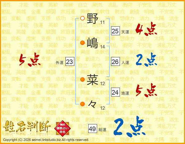 野(11画)嶋(14画) 菜(12画)々(12画)