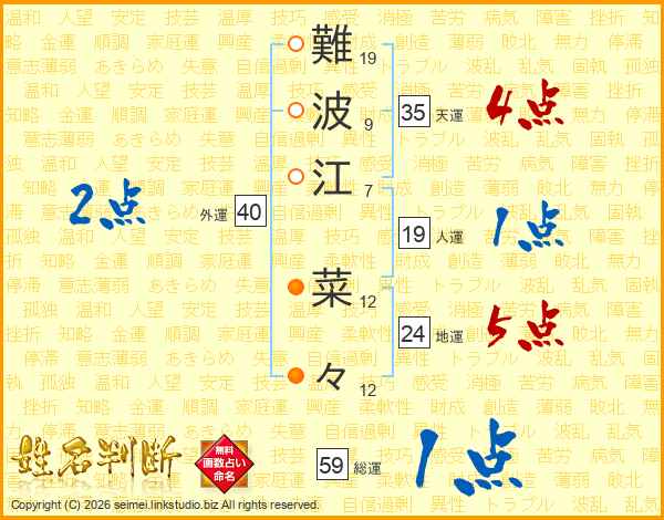 難(19画)波(9画)江(7画) 菜(12画)々(12画)