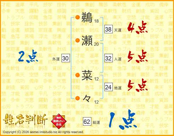 鵜(18画)瀬(20画) 菜(12画)々(12画)