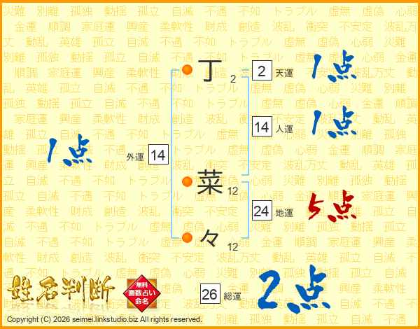 生活面を象徴する運勢です。外部から受ける影響力を表し、結婚運、家庭運や職場、環境への順応性を表します。総運から人運を引いた画数。姓や名が1文字の場合を除く。