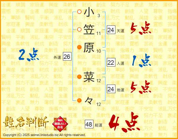 小(3画)笠(11画)原(10画) 菜(12画)々(12画)