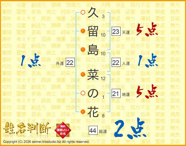 久(3画)留(10画)島(10画) 菜(12画)の(1画)花(8画)