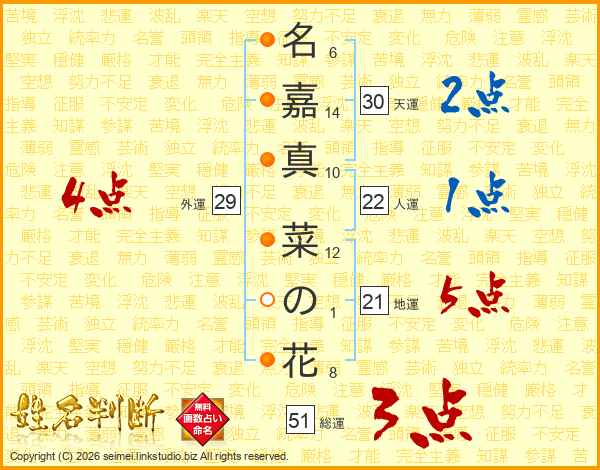 名(6画)嘉(14画)真(10画) 菜(12画)の(1画)花(8画)