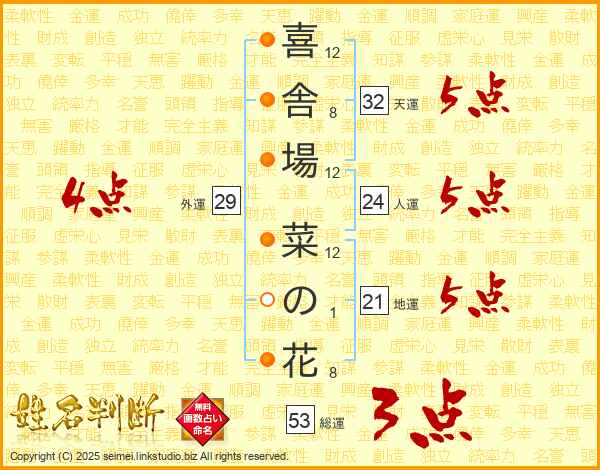 喜(12画)舎(8画)場(12画) 菜(12画)の(1画)花(8画)