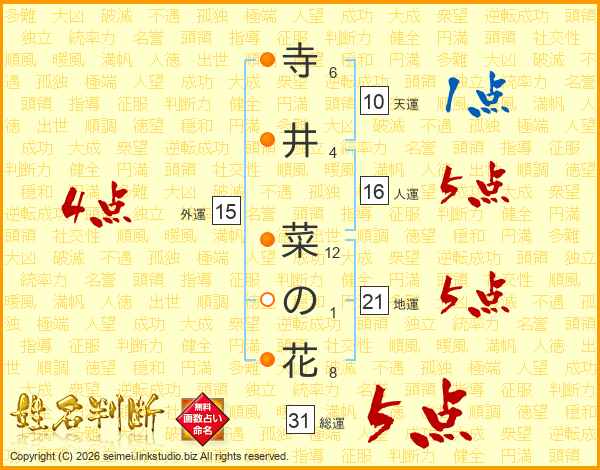 寺(6画)井(4画) 菜(12画)の(1画)花(8画)