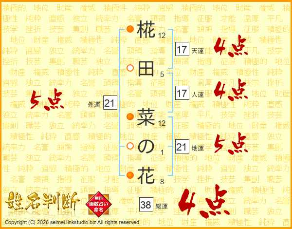 生活面を象徴する運勢です。外部から受ける影響力を表し、結婚運、家庭運や職場、環境への順応性を表します。総運から人運を引いた画数。姓や名が1文字の場合を除く。