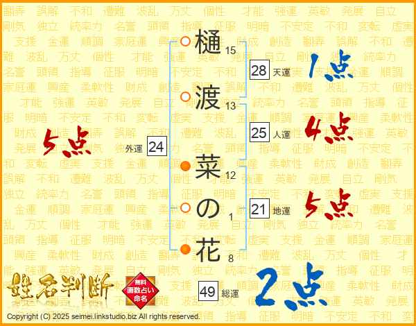 樋(15画)渡(13画) 菜(12画)の(1画)花(8画)