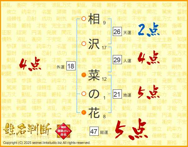 相(9画)沢(17画) 菜(12画)の(1画)花(8画)