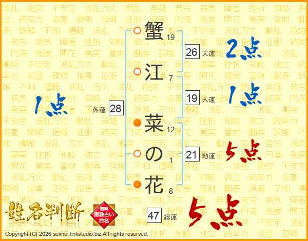 蟹(19画)江(7画) 菜(12画)の(1画)花(8画)