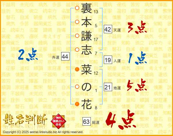 裏(13画)本(5画)謙(17画)志(7画) 菜(12画)の(1画)花(8画)