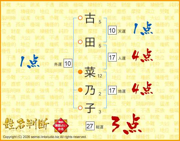 古(5画)田(5画) 菜(12画)乃(2画)子(3画)