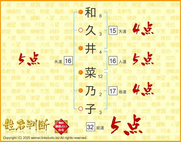 和(8画)久(3画)井(4画) 菜(12画)乃(2画)子(3画)