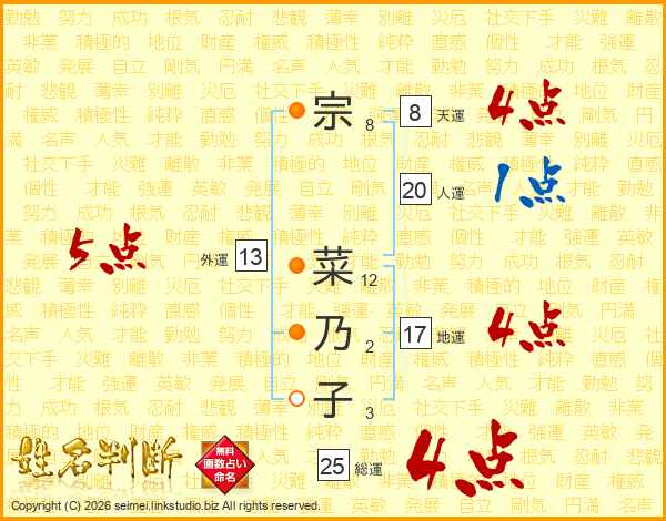宗(8画) 菜(12画)乃(2画)子(3画)