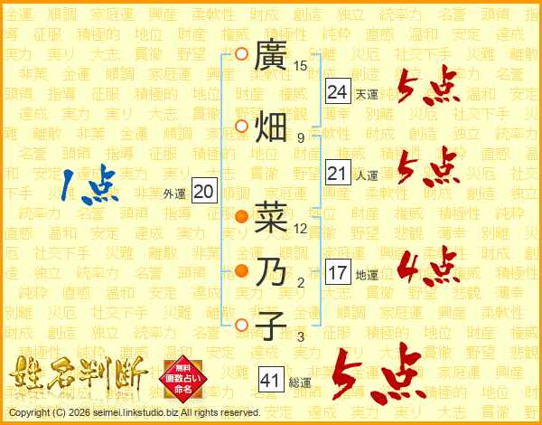 廣(15画)畑(9画) 菜(12画)乃(2画)子(3画)