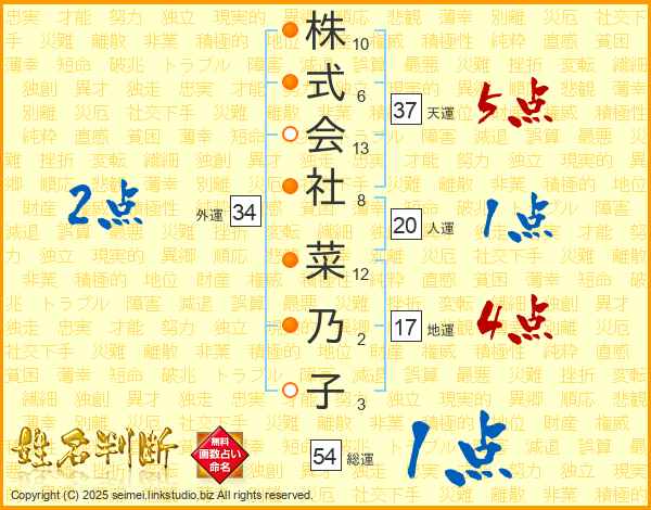 株(10画)式(6画)会(13画)社(8画) 菜(12画)乃(2画)子(3画)