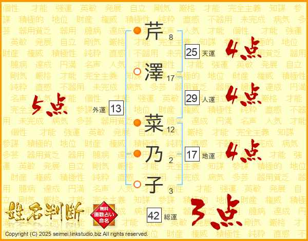 芹(8画)澤(17画) 菜(12画)乃(2画)子(3画)