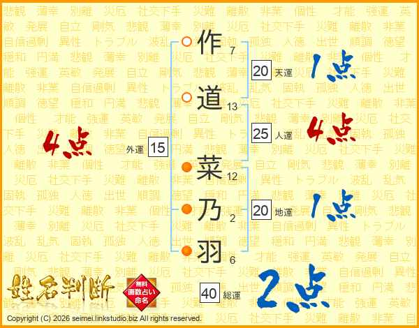 作(7画)道(13画) 菜(12画)乃(2画)羽(6画)