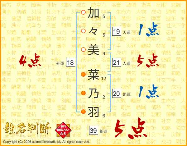 加(5画)々(5画)美(9画) 菜(12画)乃(2画)羽(6画)
