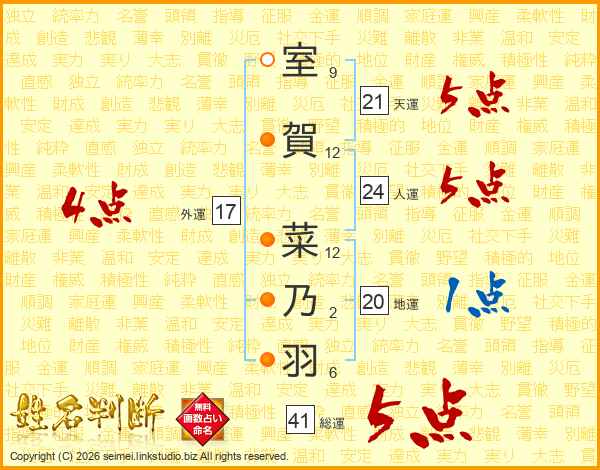 室賀菜乃羽さんの総運は41画の5点!