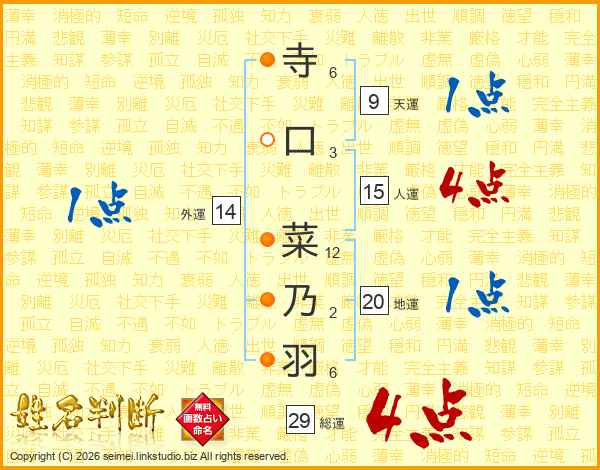 寺(6画)口(3画) 菜(12画)乃(2画)羽(6画)