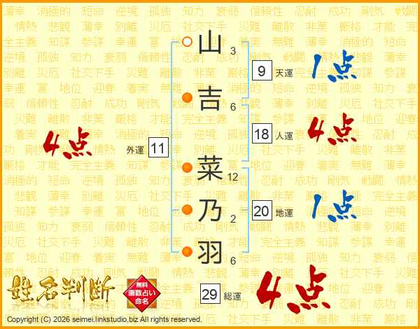 山(3画)吉(6画) 菜(12画)乃(2画)羽(6画)
