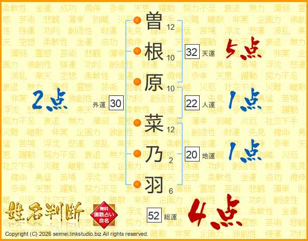 曽(12画)根(10画)原(10画) 菜(12画)乃(2画)羽(6画)