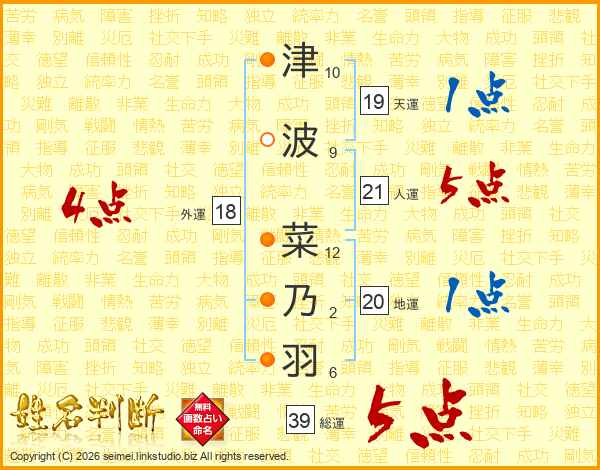 津(10画)波(9画) 菜(12画)乃(2画)羽(6画)