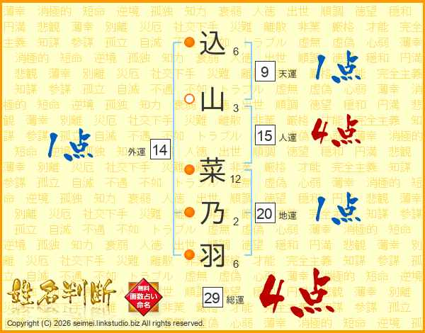 込(6画)山(3画) 菜(12画)乃(2画)羽(6画)