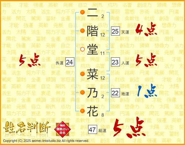 二(2画)階(12画)堂(11画) 菜(12画)乃(2画)花(8画)